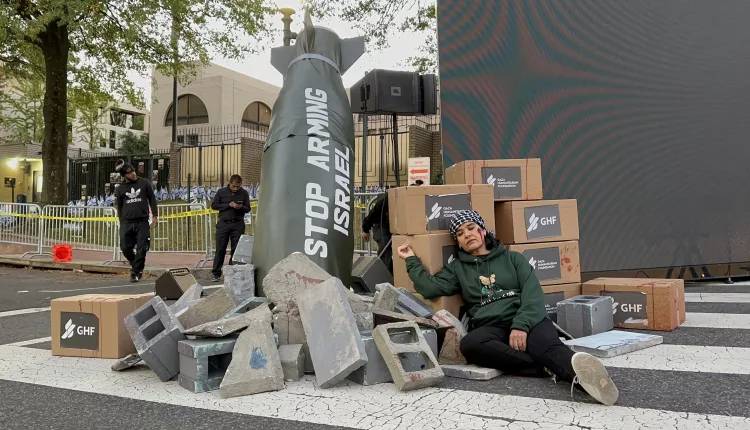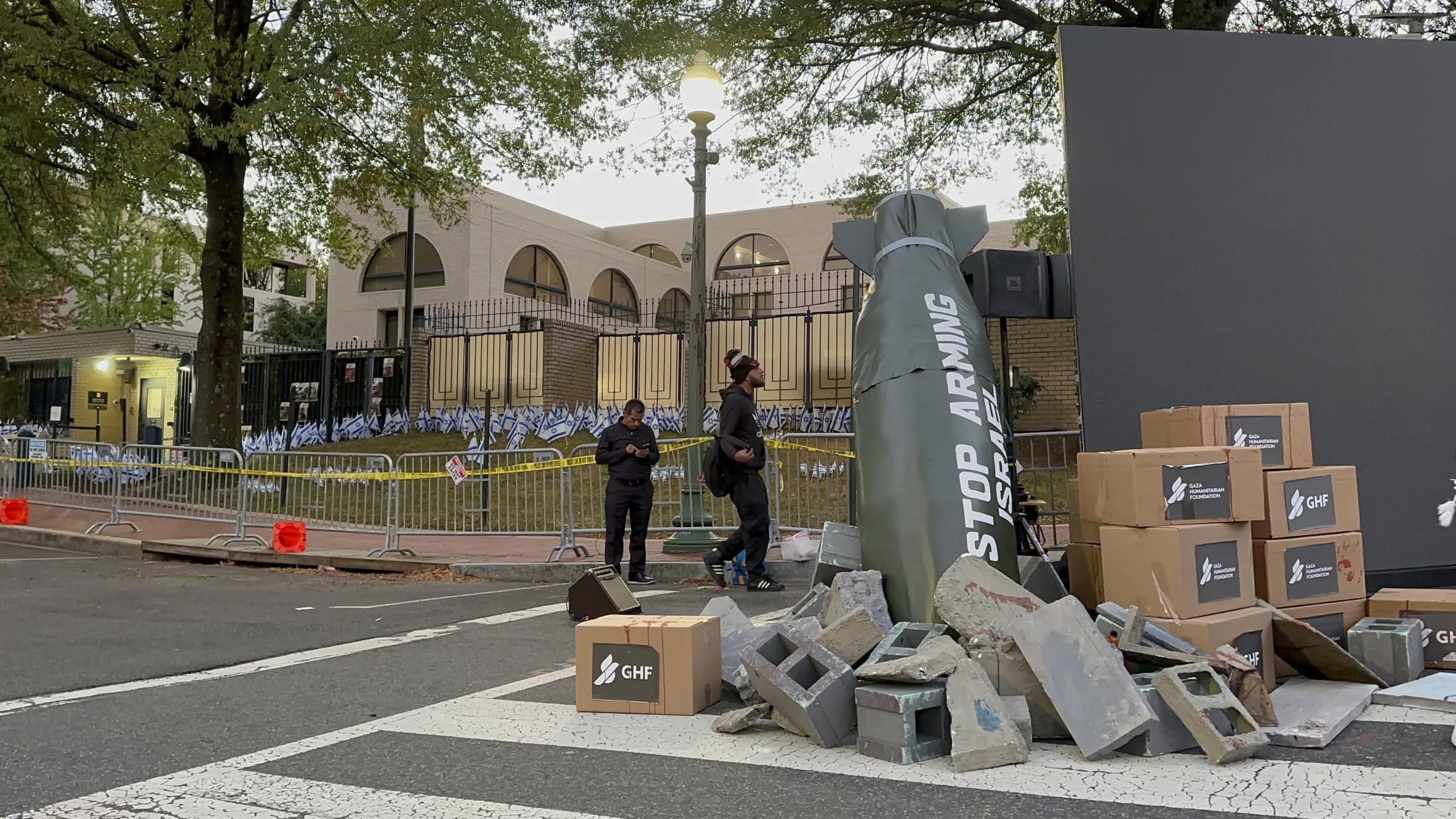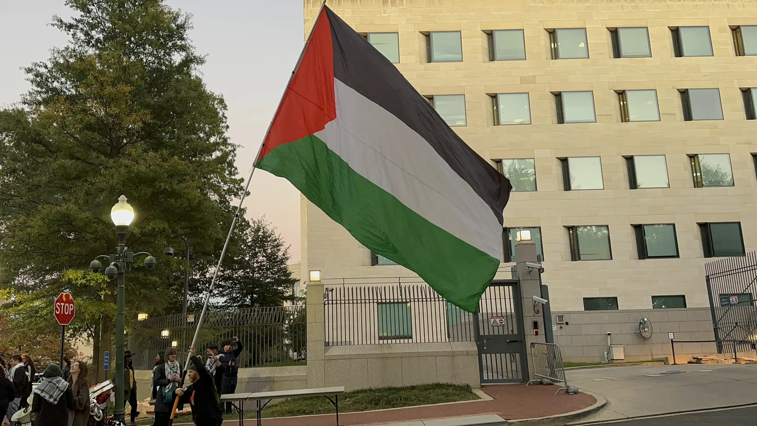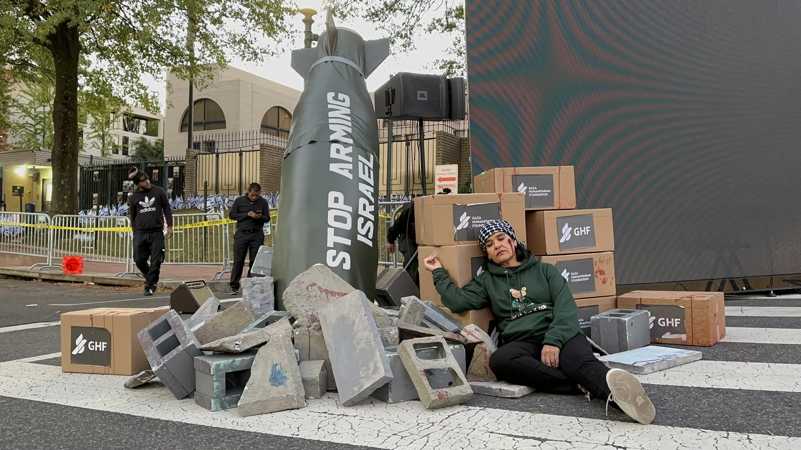 A group of activists gathered outside the Israeli Embassy in Washington, D.C., calling for an end to Israel’s blockade of Gaza. The protest, titled “From the Sea to DC,” included members of the Global Sumud flotilla, who were detained by Israeli forces in international waters while attempting to deliver aid to Gaza. Many of the flotilla members spoke publicly for the first time, recounting the torture they endured during their imprisonment by Israeli forces.