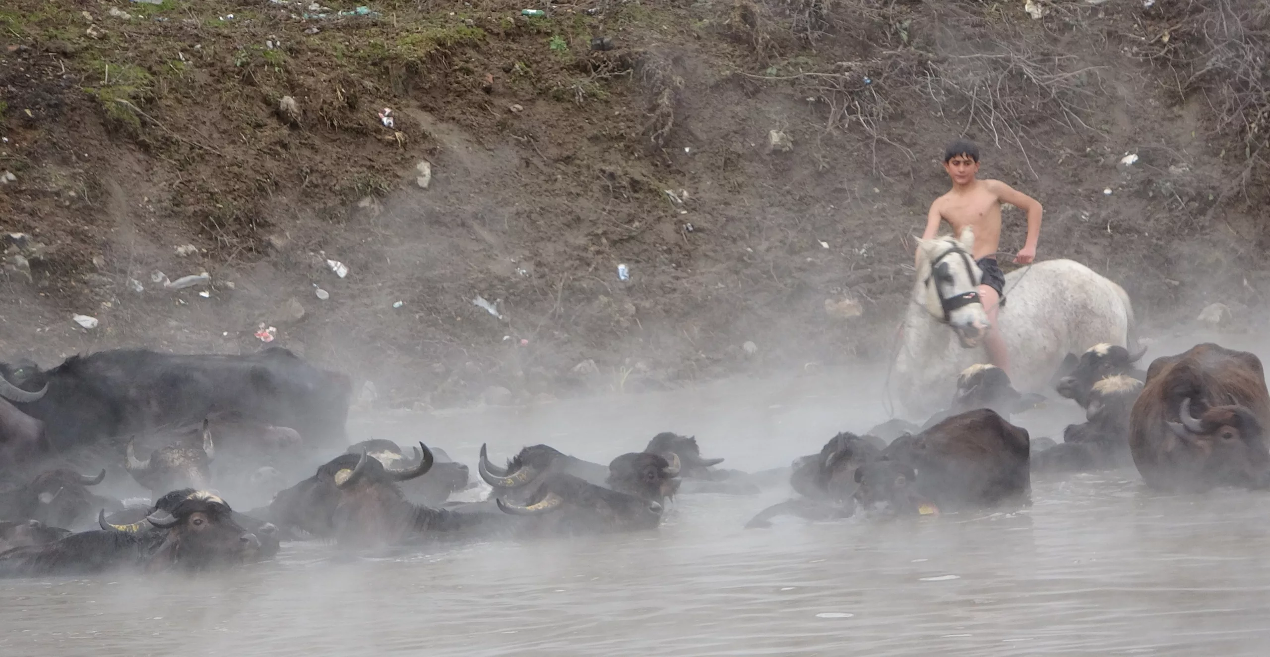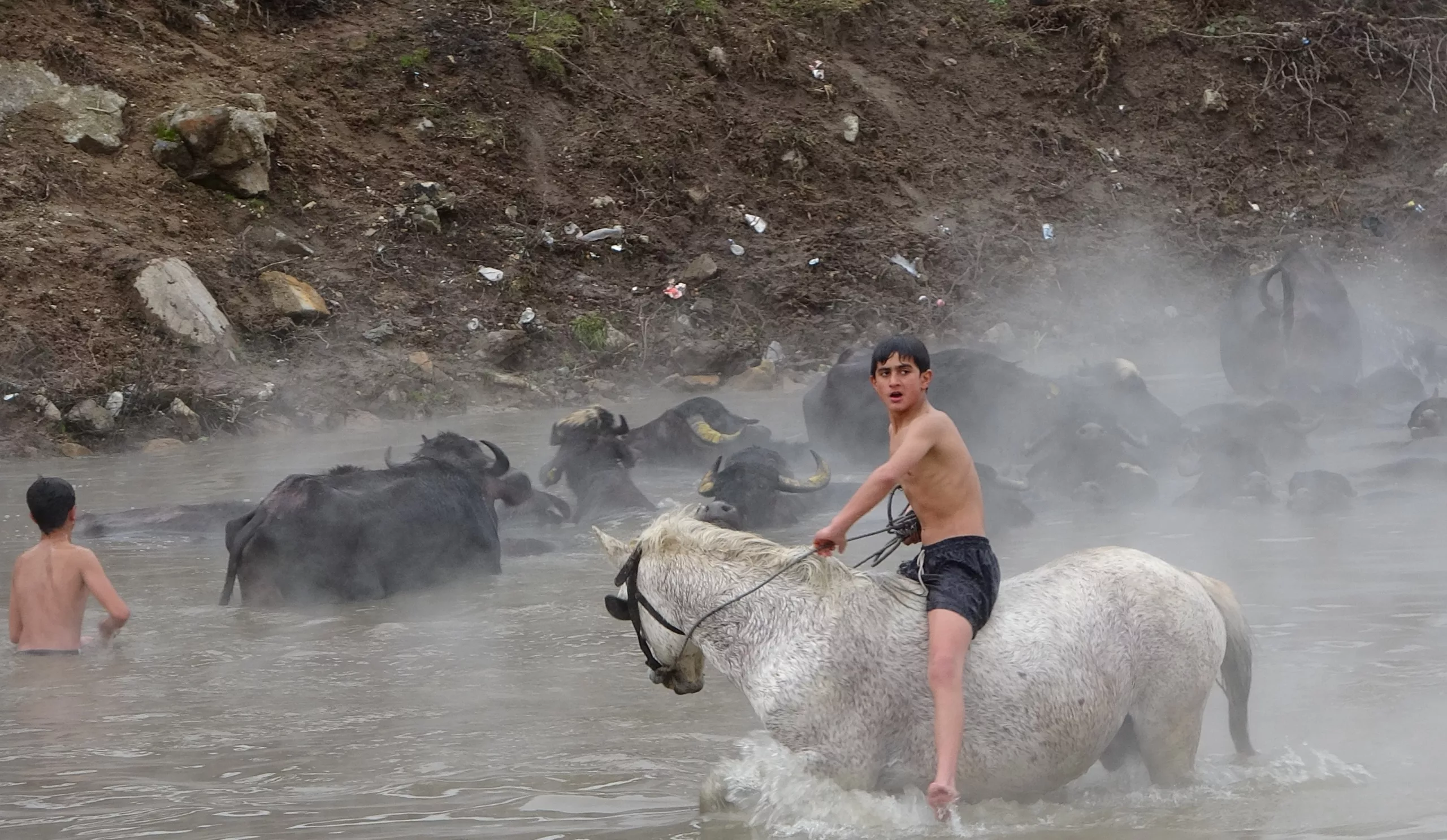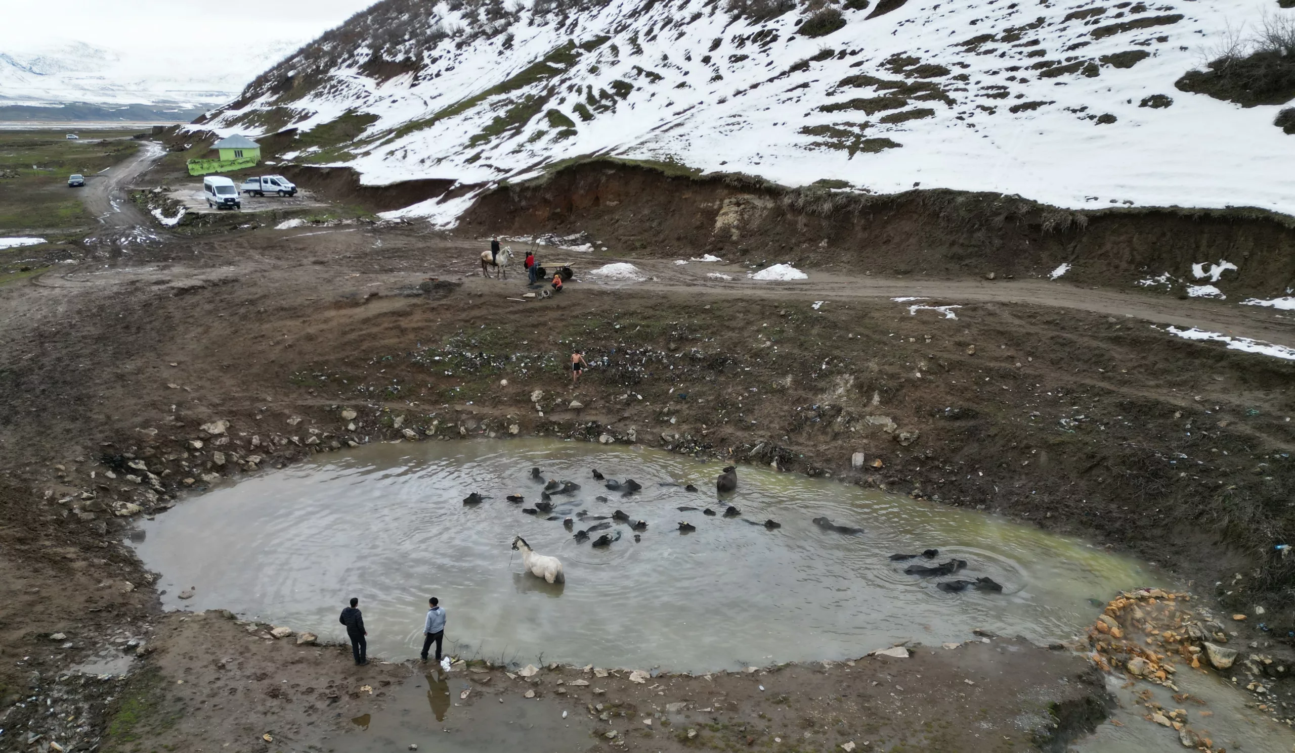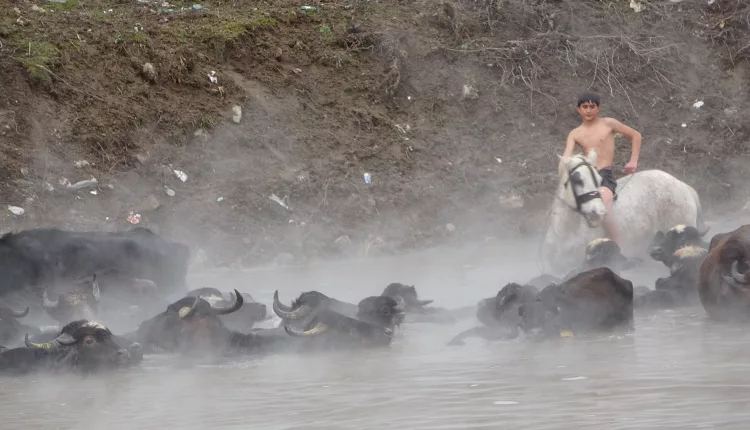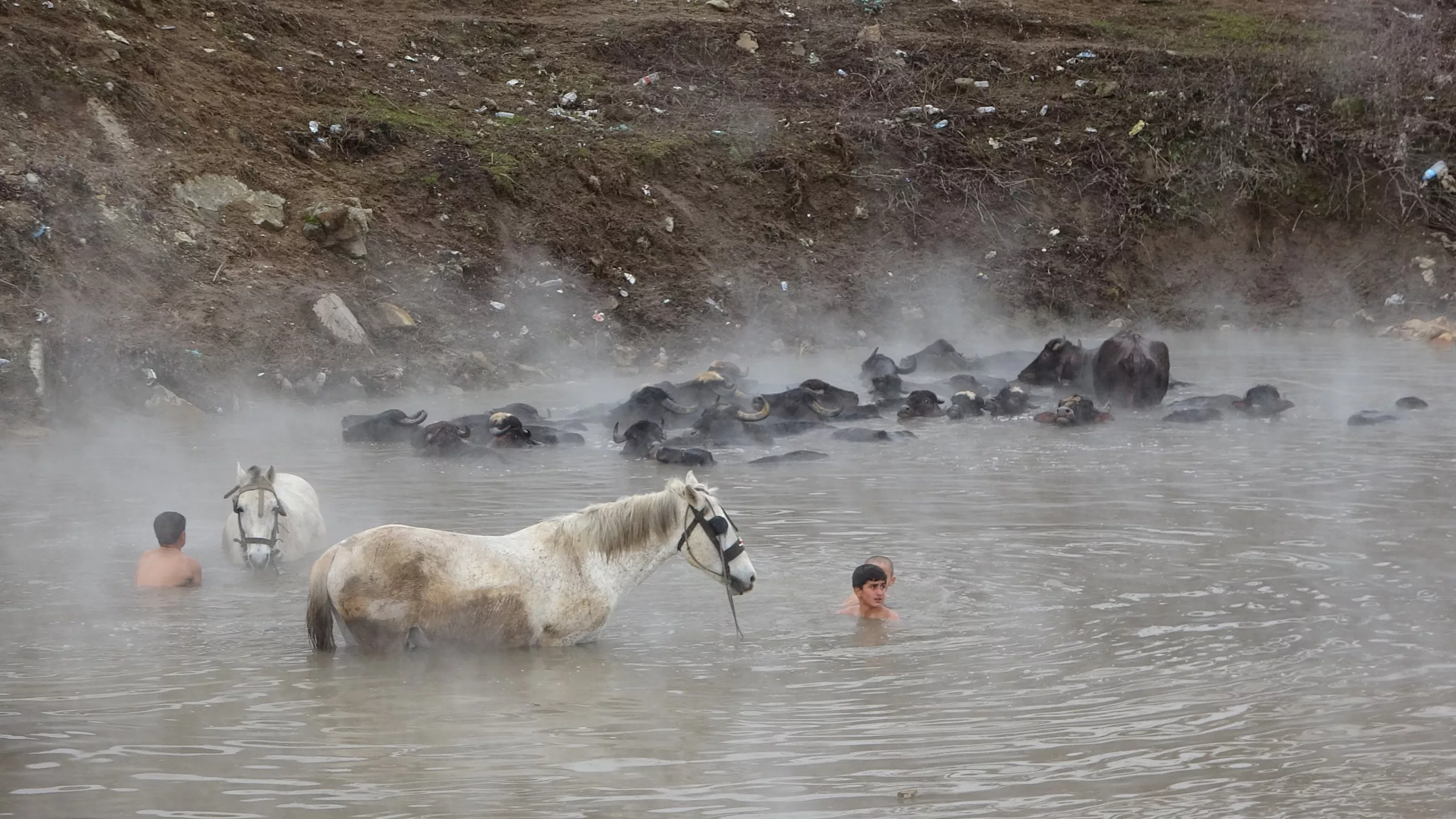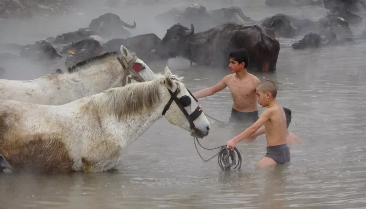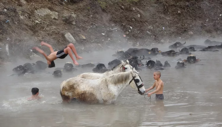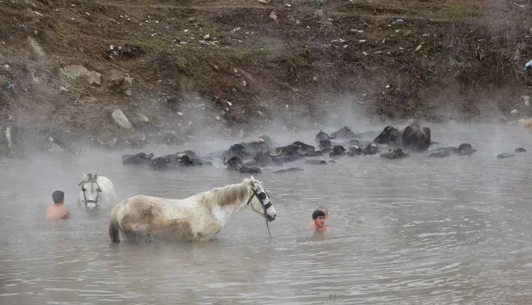 Buffaloes and horses were brought to Budaklı Hot Springs in the Güroymak district of Bitlis, eastern Türkiye, for cleaning during winter, creating striking scenes. The animals calmly stood in the steaming thermal waters despite freezing temperatures, drawing the attention of photographers.