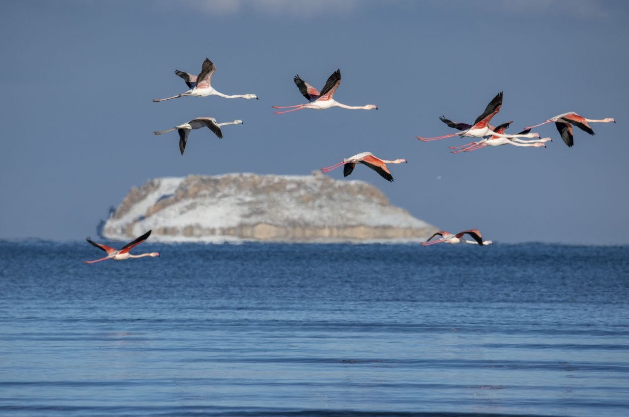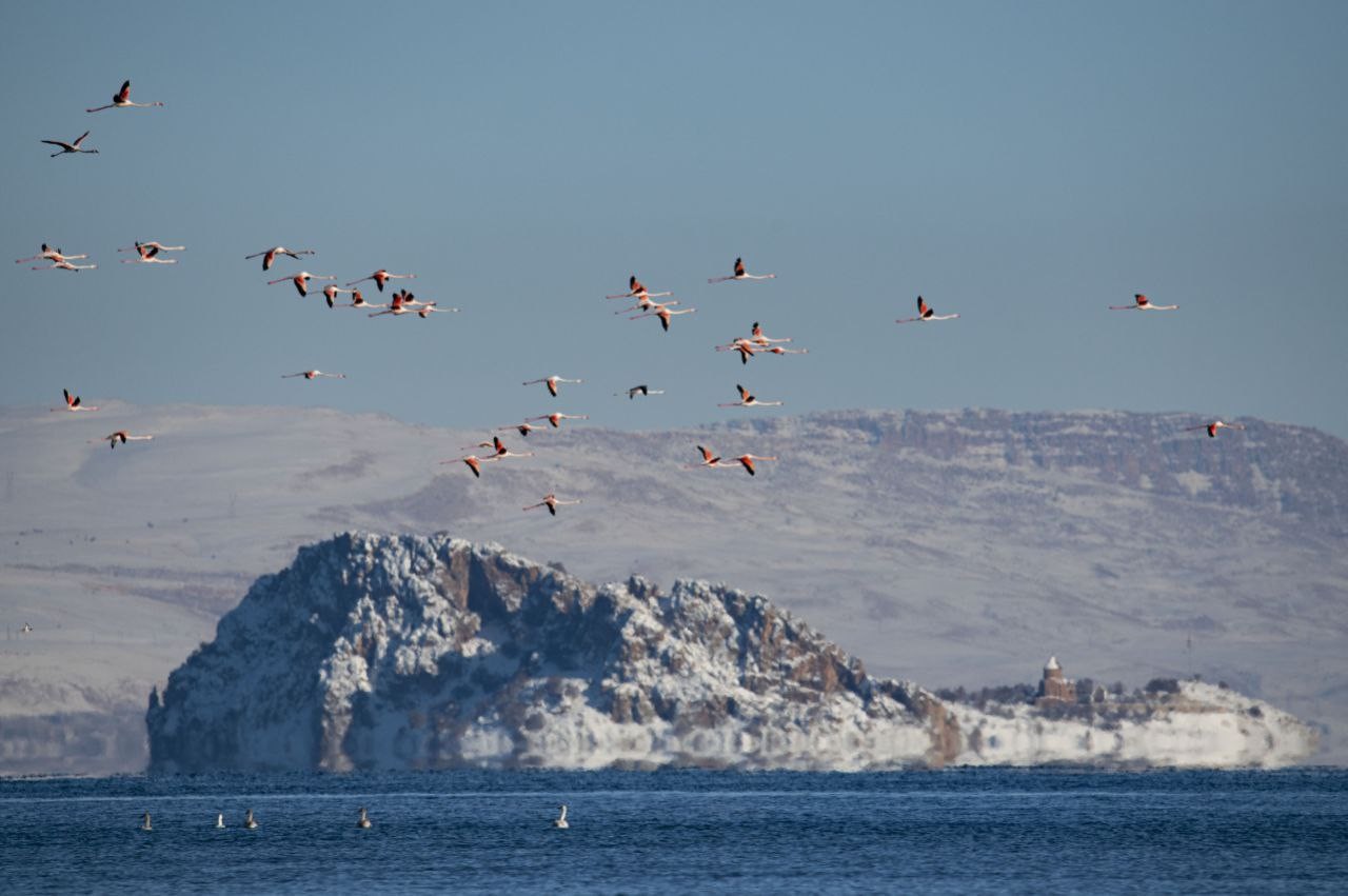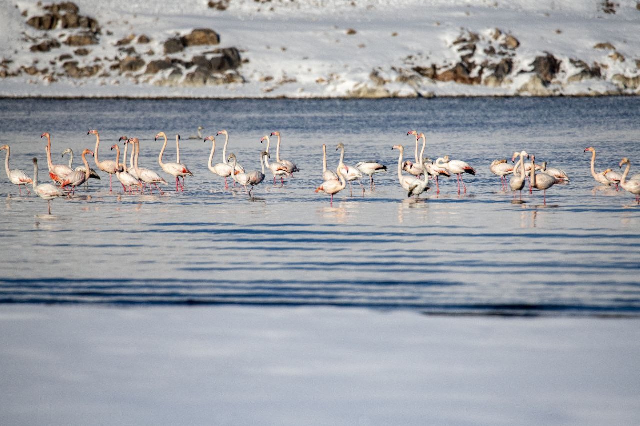 The Van Lake, known for its diverse bird population, is home to 250 of Turkey’s approximately 450 bird species. This year, flamingos from Iran’s Urmia Lake settled in large groups in Erçek Lake, Çelebağı wetland, Muradiye Bendimahi wetland, and Gevaş Göründü wetland, before migrating to African countries after spending some time in the Van Lake Basin.