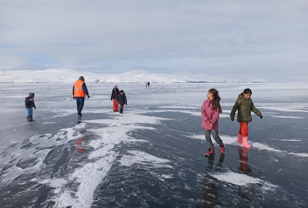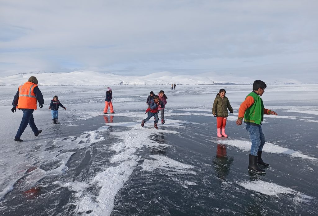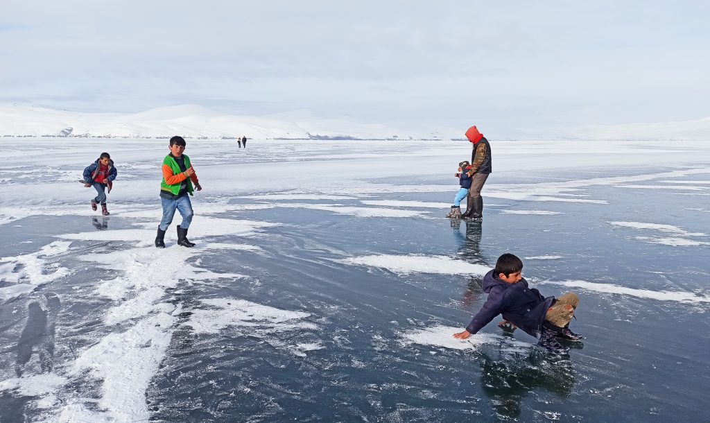 With the arrival of the winter season, the Lake Nazik located at Ahlat district in Turkey’s city of Bitlis, frozen up due to the severe colds. With an area of 40 square kilometers, Lake Nazik has become a playground for children after it was completely frozen. Children living in the of Dilburnu village, on the shore of the lake, took advantage of the semester break and spends time on the frozen lake. Meanwhile, children told that they had a good time skating and playing various games on the lake all day long.