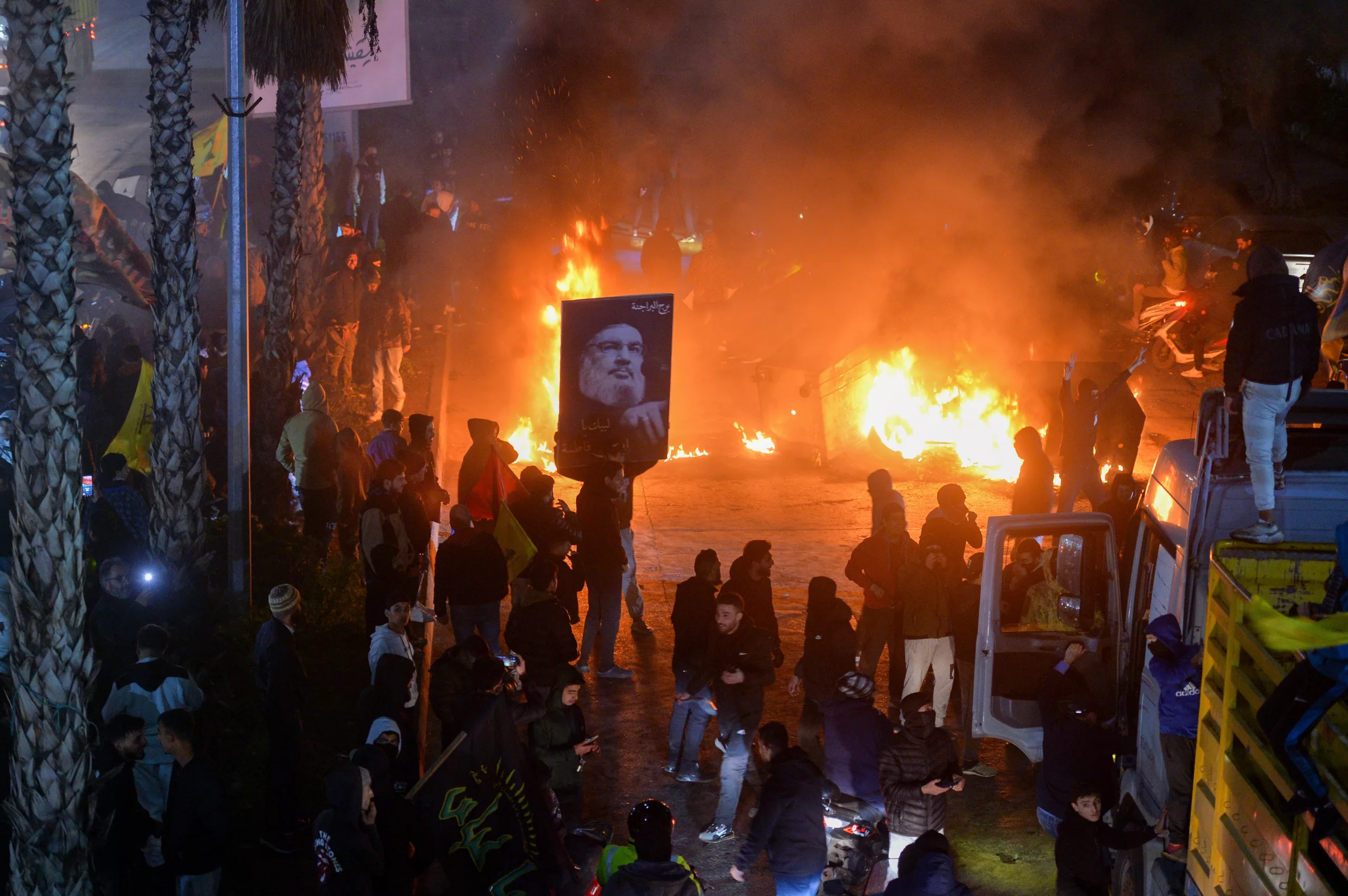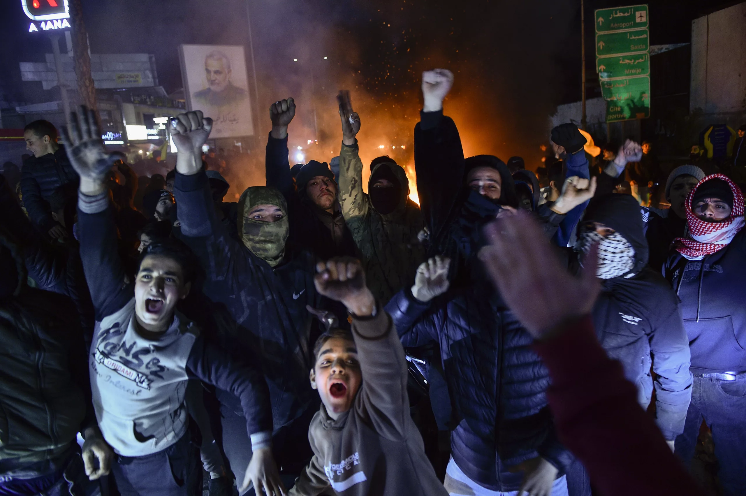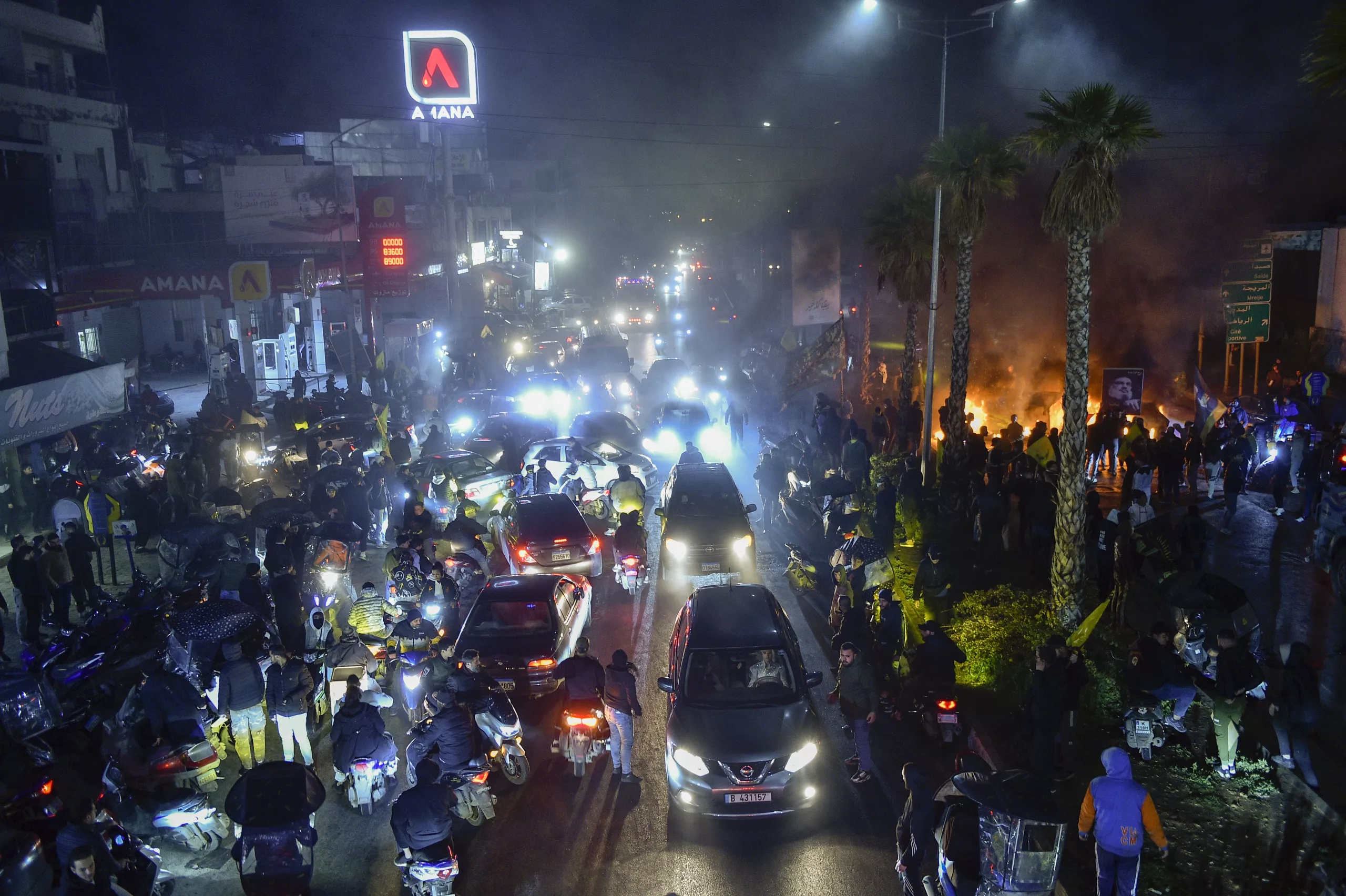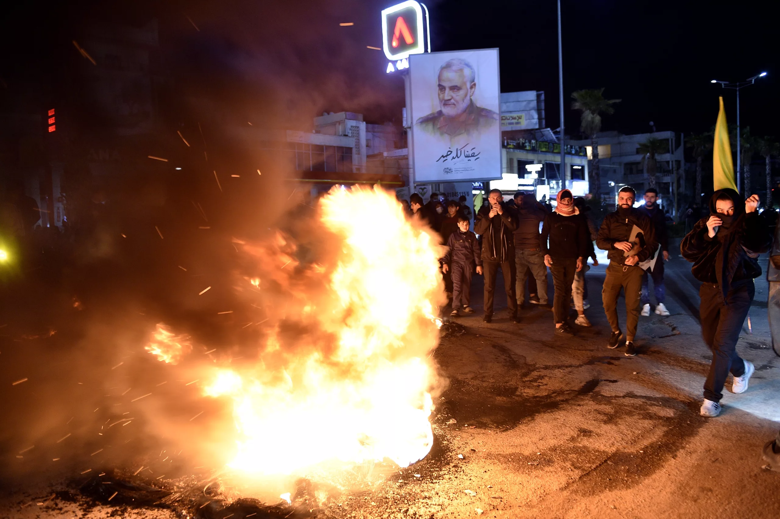 Hezbollah supporters blocked the main road to Rafik Hariri International Airport in Beirut and set tires on fire after Lebanon denied landing permission for an Iranian Mahan Airlines plane. The flight, scheduled from Tehran, was canceled, leaving dozens of Lebanese passengers stranded.