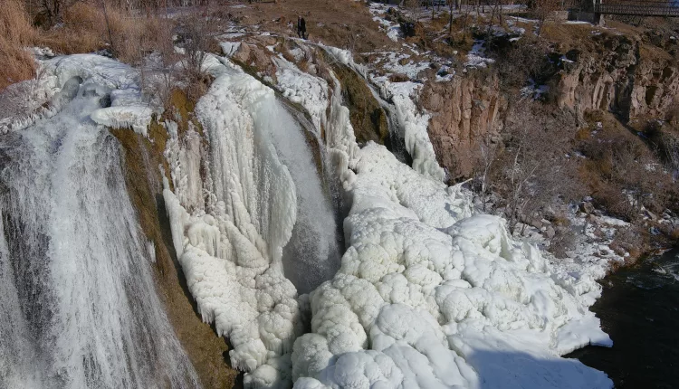 Muradiye Waterfall, which froze as the temperature dropped to -15 degrees in the Van province of Türkiye and turned into a work of art, continues to welcome nature and photography lovers despite the cold.