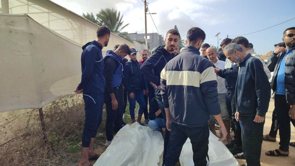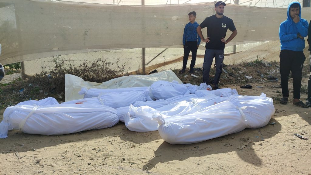 Dozens of Palestinians trying to survive another day in the Gaza Strip held a funeral ceremony in an area between Maghazi and Bureij refugee camps to bury their relatives in a mass grave. Some of them could not hold back their tears while the people they knew and loved were being buried side by side.