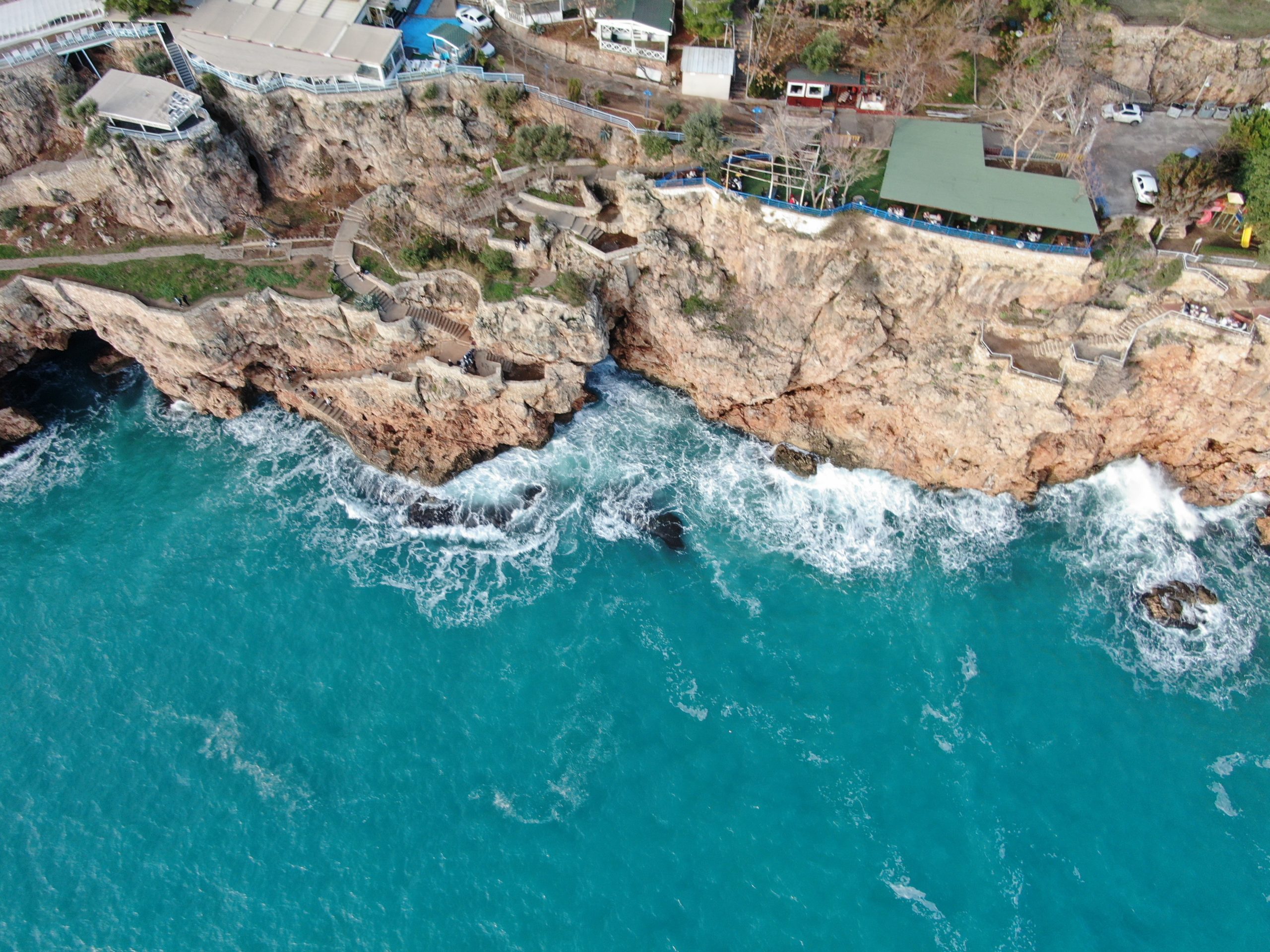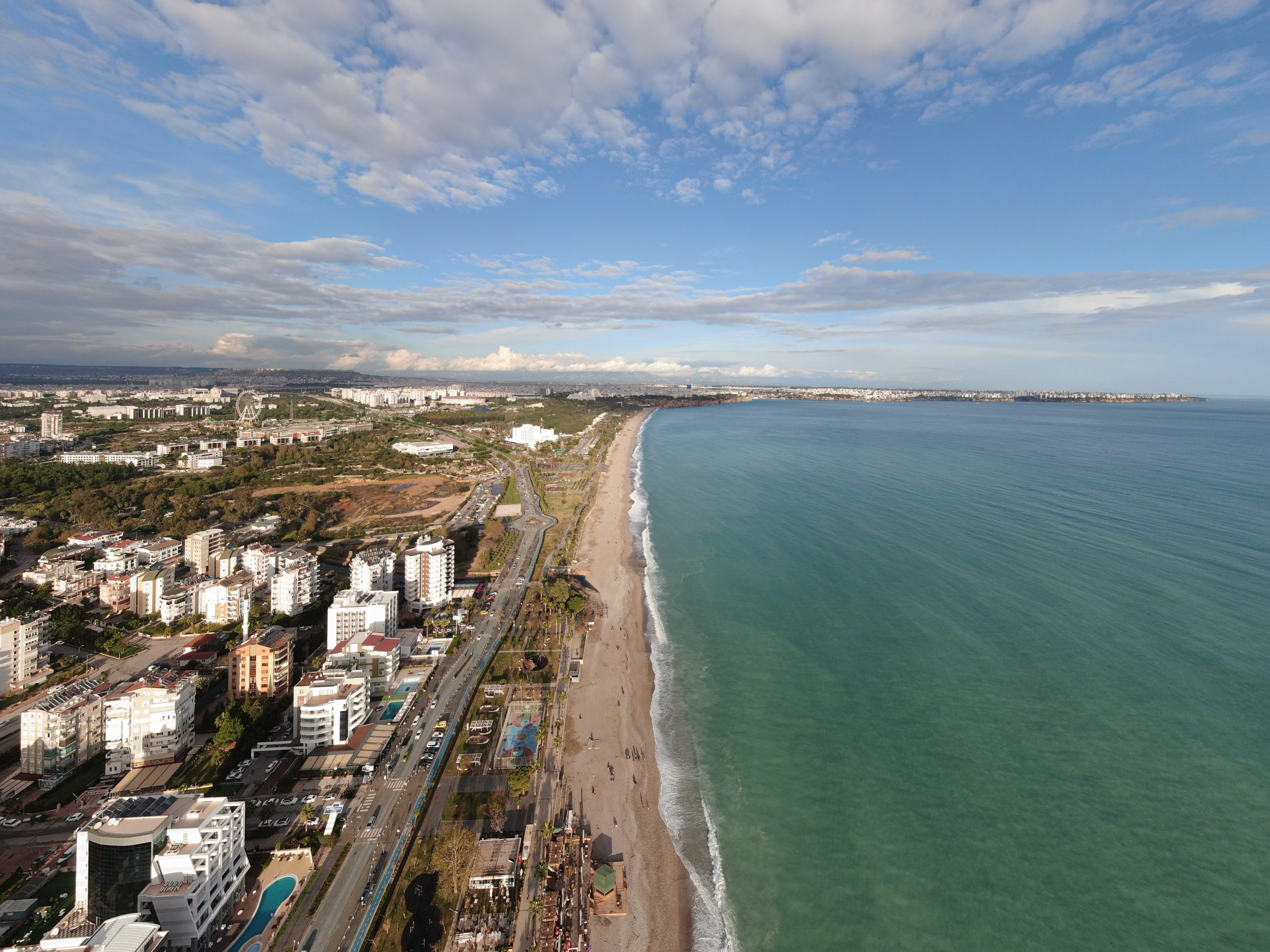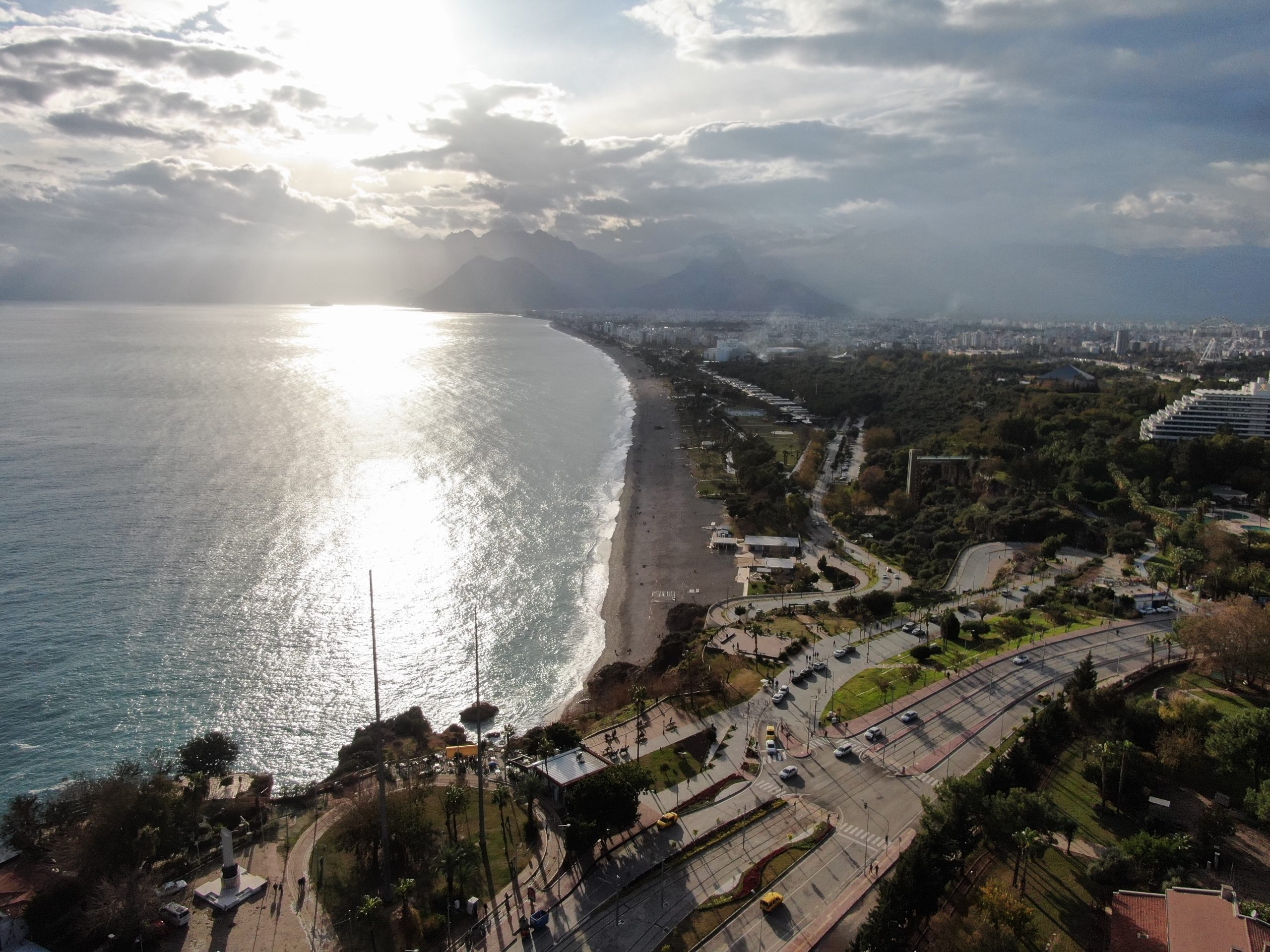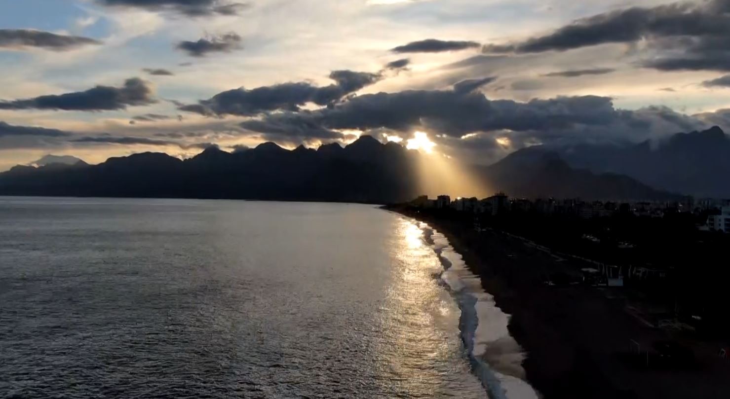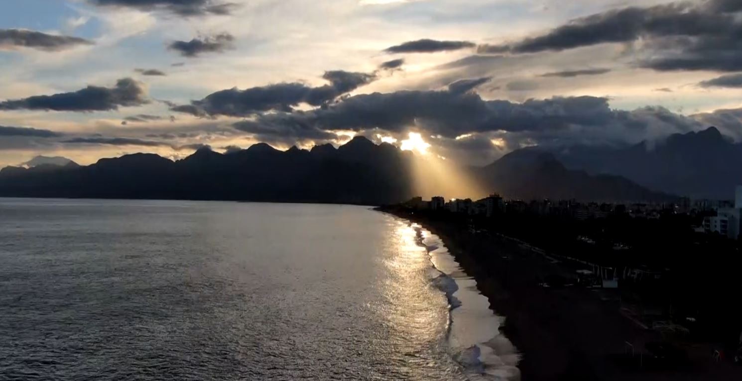 Worldwide known Konyaaltı Beach of Antalya city, Turkey, recorded from different angles by drones. It’s been observed that the sea, which turned into brown colour due to rainwater flowed in recent days, turned back to its original color in the footage. As with the sun set down the light beam that shine through between clouds revealed postcard like scenes. On the beach, which was recorded from a bird’s eye view, people who entered the sea with the sunset and those who took a walk were also reflected in the camera.