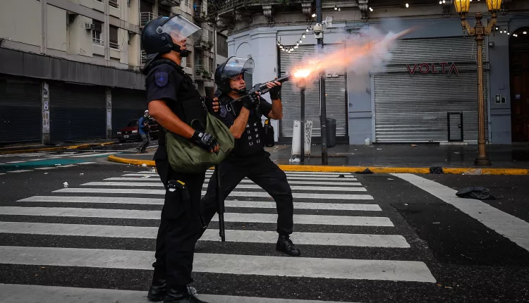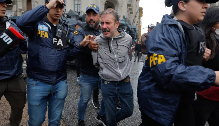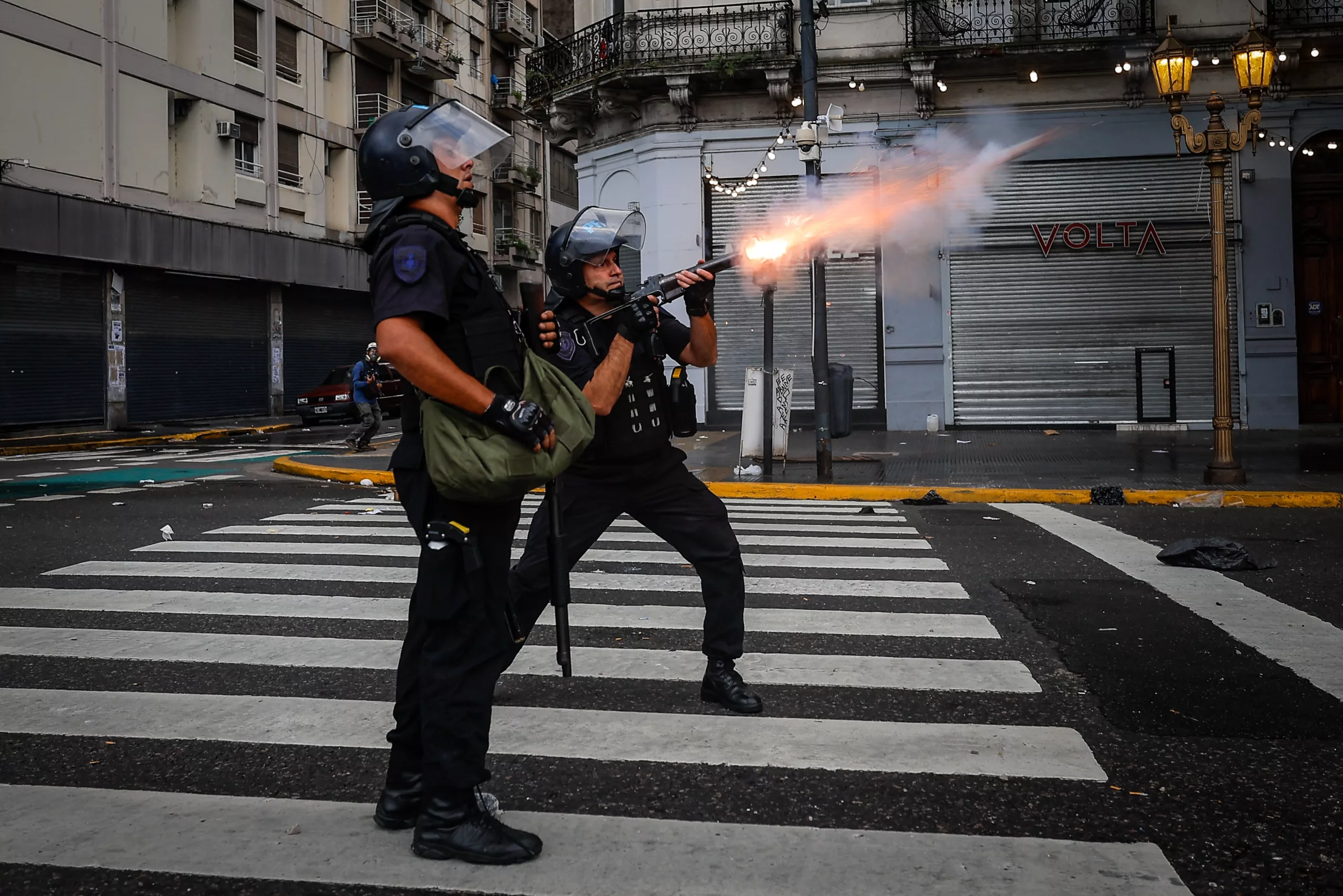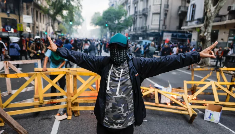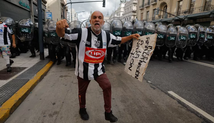 Thousands of retirees and football fans protested President Javier Milei’s budget cuts in Buenos Aires, clashing with police. Demonstrators threw stones, fireworks, and sound bombs, prompting police to respond with tear gas and water cannons.
