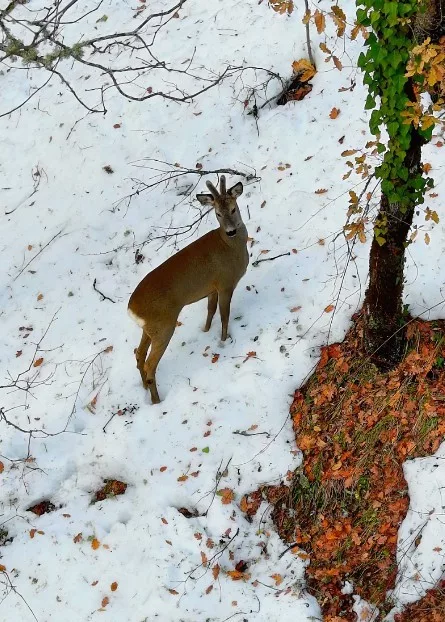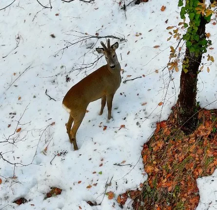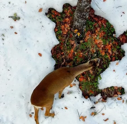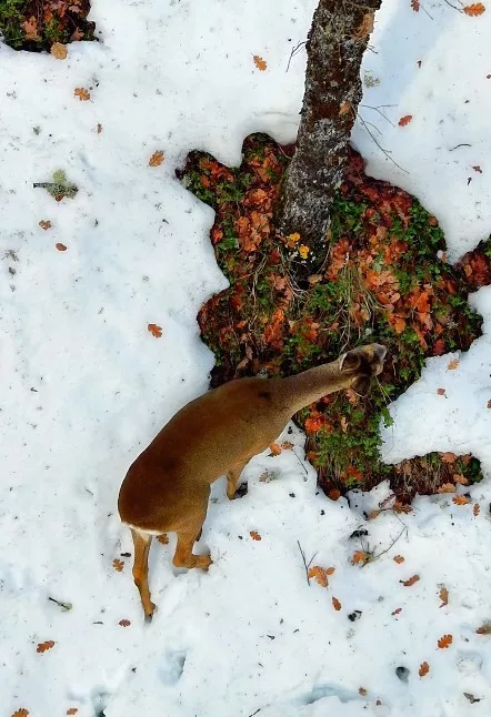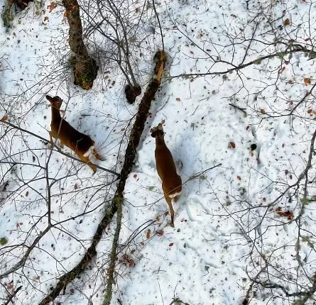Two roe deer were filmed searching for food in a snow-covered forest in the Şenpazar district of Kastamonu, Türkiye, after heavy snowfall hit the region. The animals were spotted in the Kastamonu section of the Küre Mountains National Park, where forests were blanketed in snow following days of severe winter weather. Drone footage showed the roe deer cautiously moving through the terrain and stopping to forage.