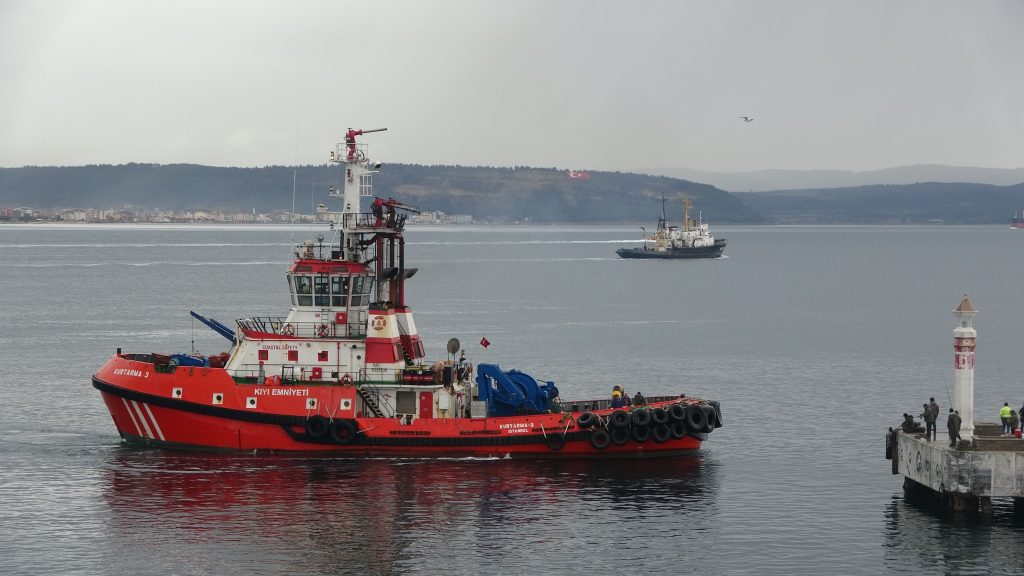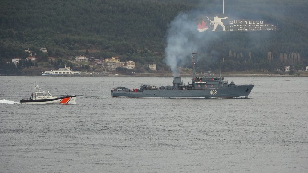 On Wednesday, a Russian Navy Minesweeper with 908 bow number Russian Natya Class “Vice-admiral Zakharin” and a Russian Navy MB-304 bow number Russian Sorum Class military tugboat enter the Dardanelles Strait of Turkey at around 12:00 PM. After they reached the fronts of Çanakkale city of Turkey at around 01:30 PM, both ships were passed through in fronts of “Kilitbahir Castle” and “Dur Yolcu” symbol at the Dardanelles Strait and move forward to Sea of Marmara after turning the Nagara Point. Meanwhile, boats form Turkish Coast Guard accompanied the Russian ships while it passing through.