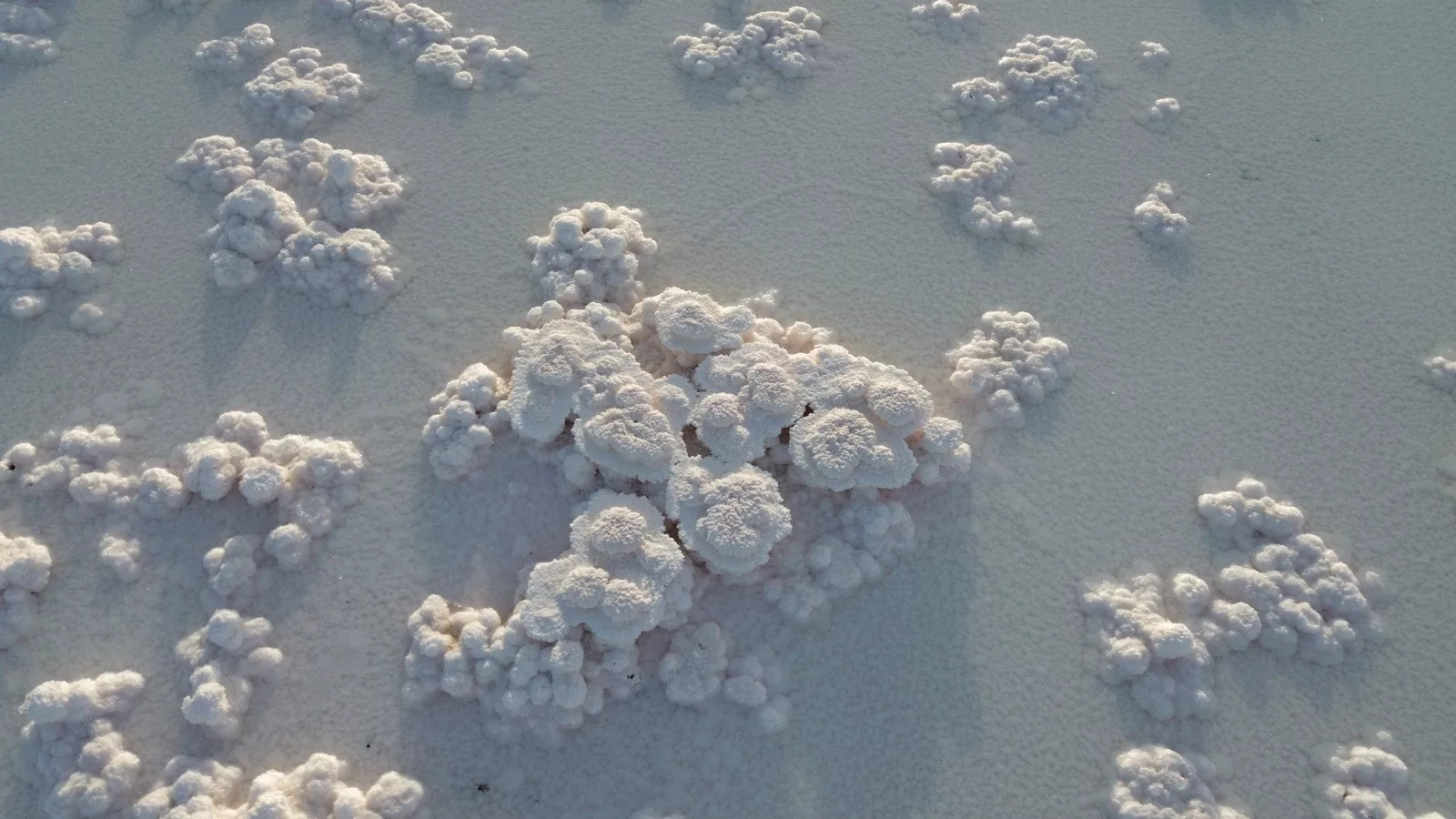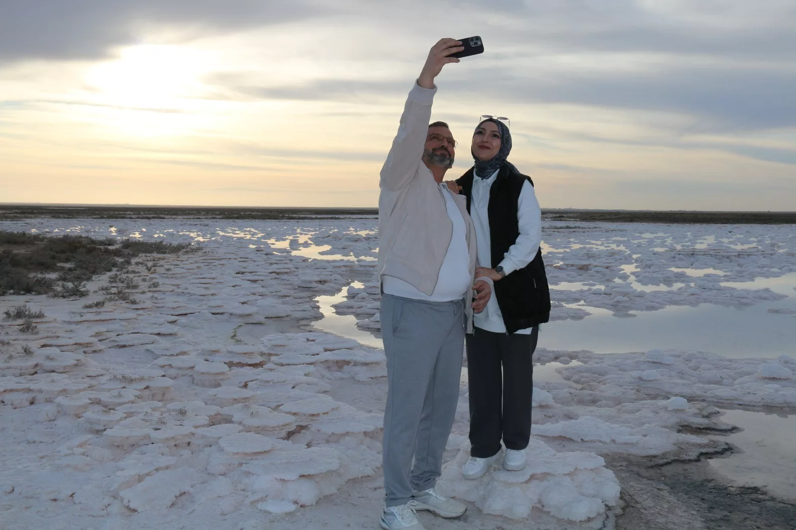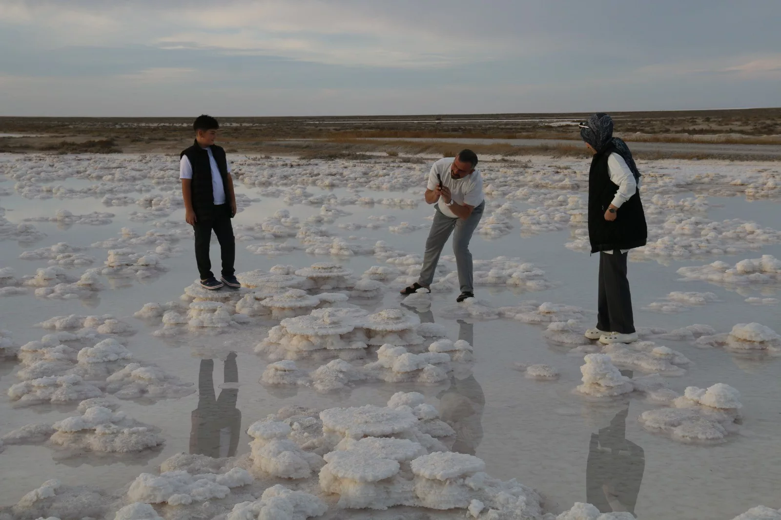 Shaped like daisies and mushrooms, the salt flats form striking patterns across the lake’s white surface, creating postcard-like scenes. Tourists from across Türkiye and abroad are visiting to photograph the landscape and walk barefoot on the mineral-rich ground.