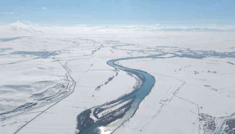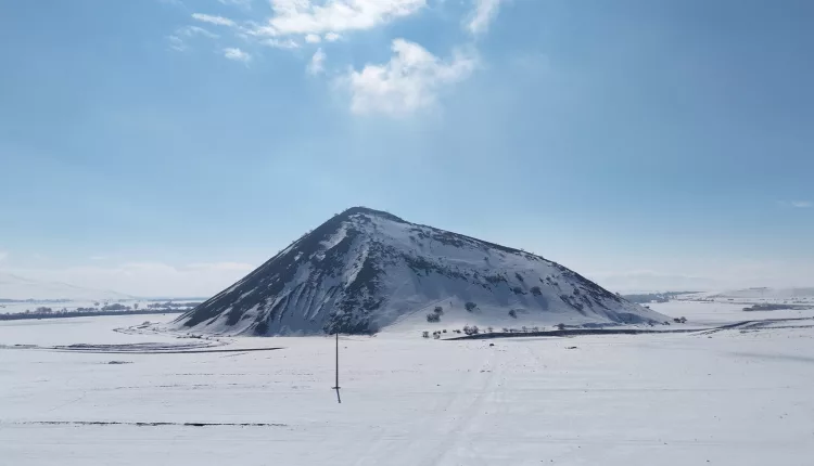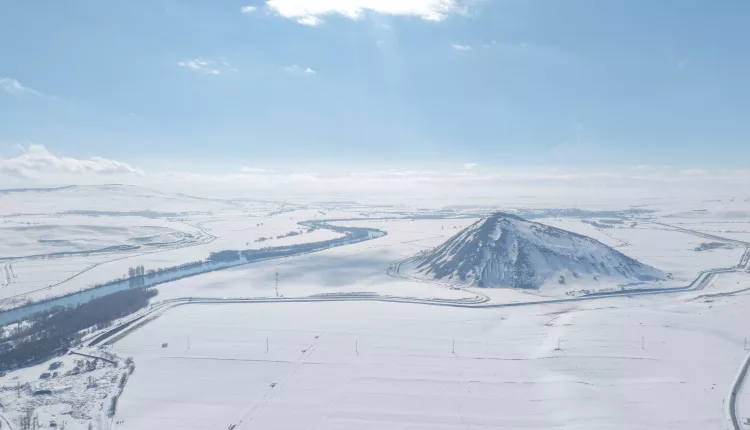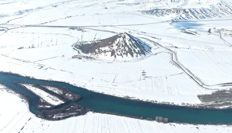 The Mercimek Kale Mound, known as the “Muş Pyramid,” was blanketed in snow after heavy snowfall in Muş province in eastern Türkiye, creating striking winter views. Located along the Murat River, the mound’s pyramid-like shape stood out against the white landscape, drawing attention from nature and history enthusiasts.
