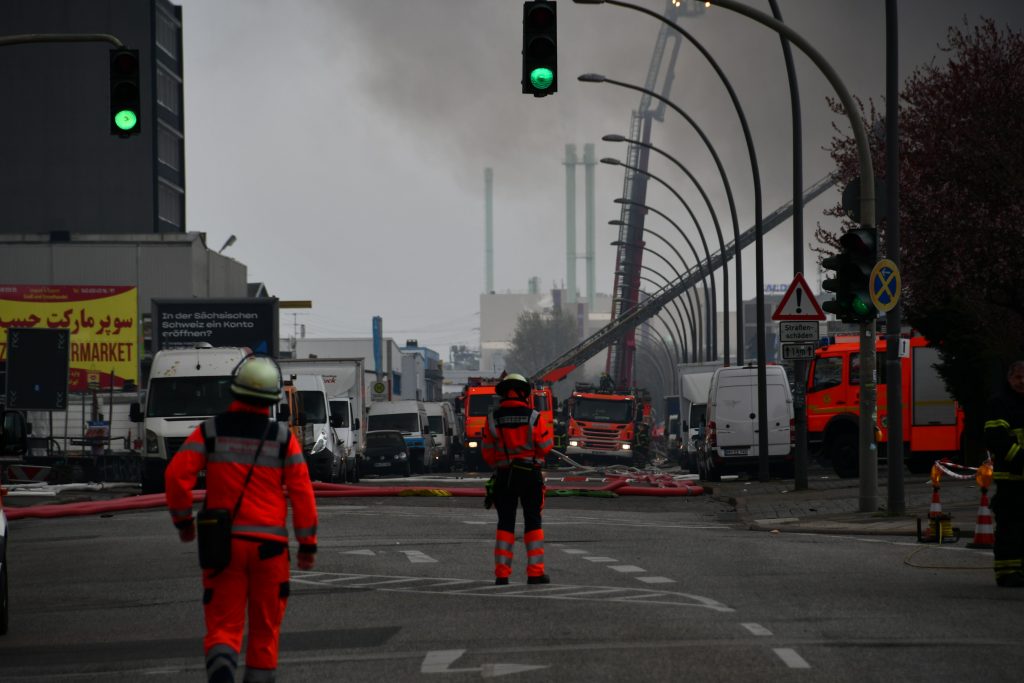 For an unknown reason, a fire broke out in a storage facility, where mostly Afghans and Turks sell second-hand goods, on Billstr Street in Hamburg, Germany. The smoke spread to the city center, which is 3-4 kilometers away. Police evacuated at least 140 people from the area in case of poison gas.