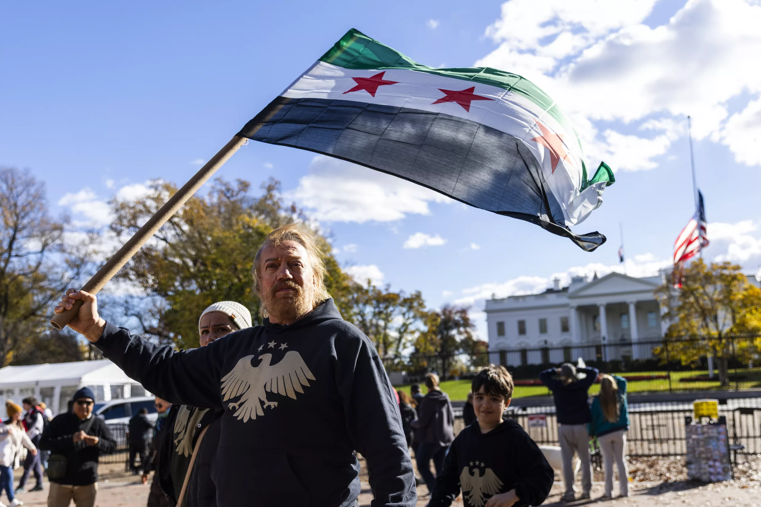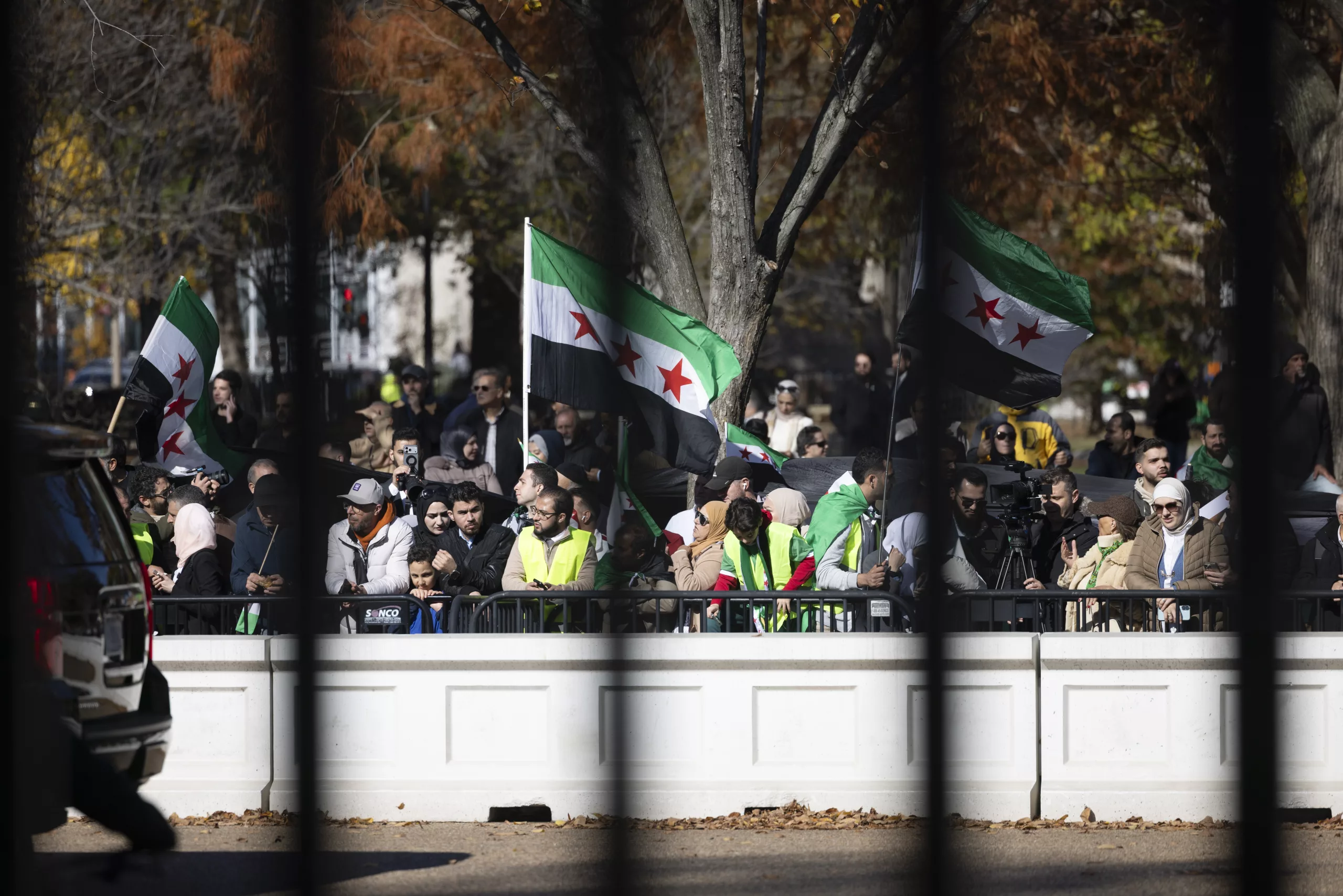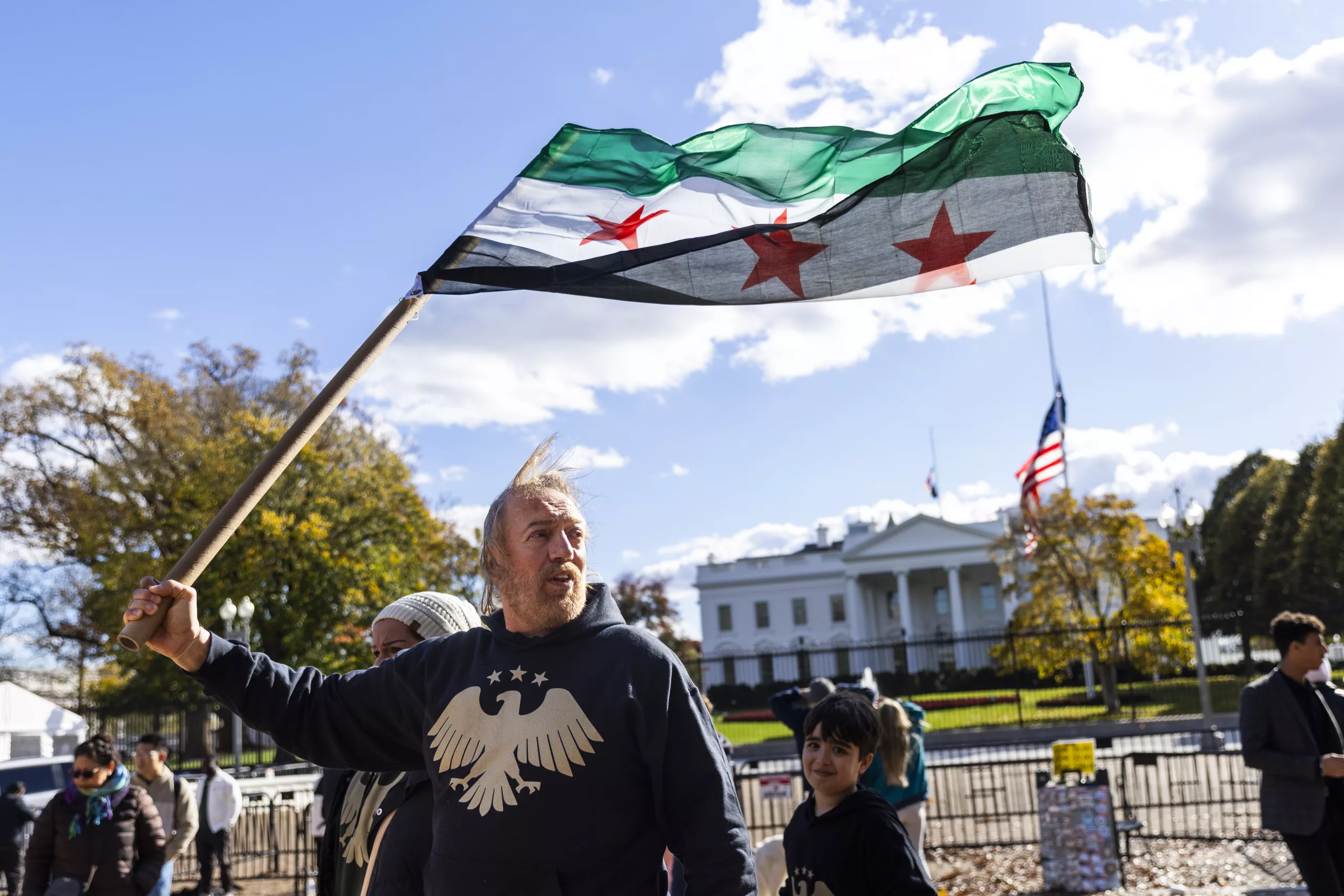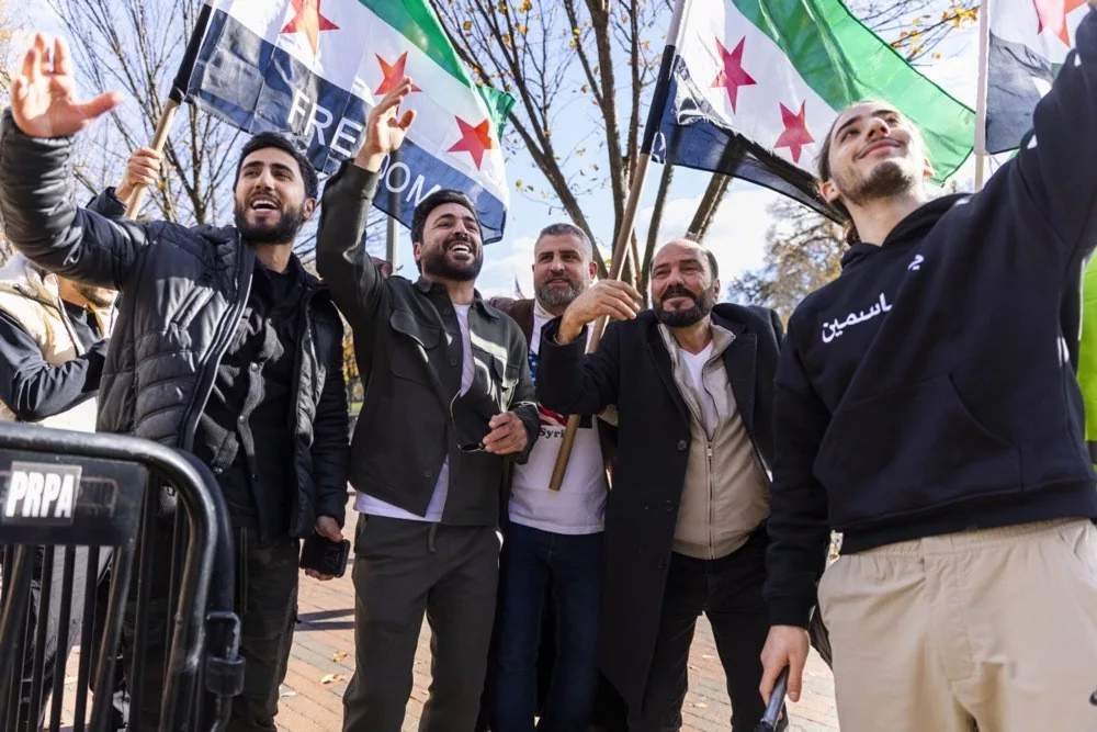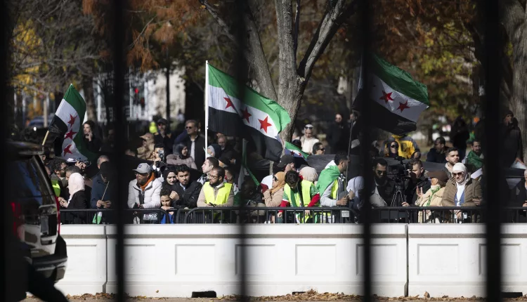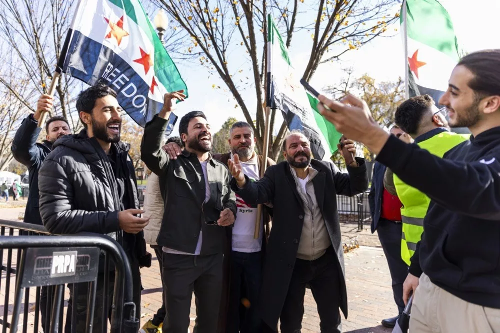 Syrians living in the United States gathered in Lafayette Park, Washington D.C., to greet Syrian President Ahmed al-Shara as he left the White House after meeting US President Donald Trump. Waving Syrian flags, the crowd cheered as al-Shara stopped his convoy and saluted them in response.