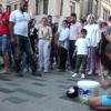 boy plays drum on yogurt bucket on street