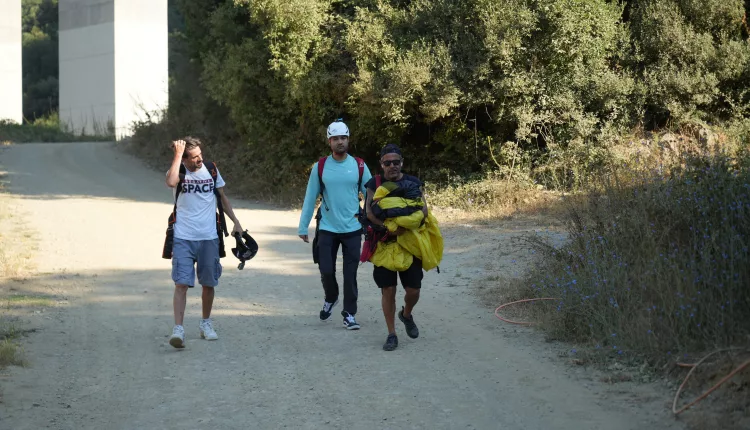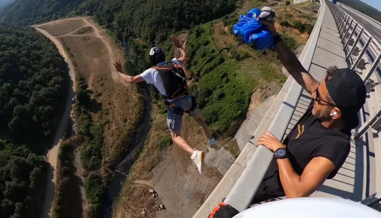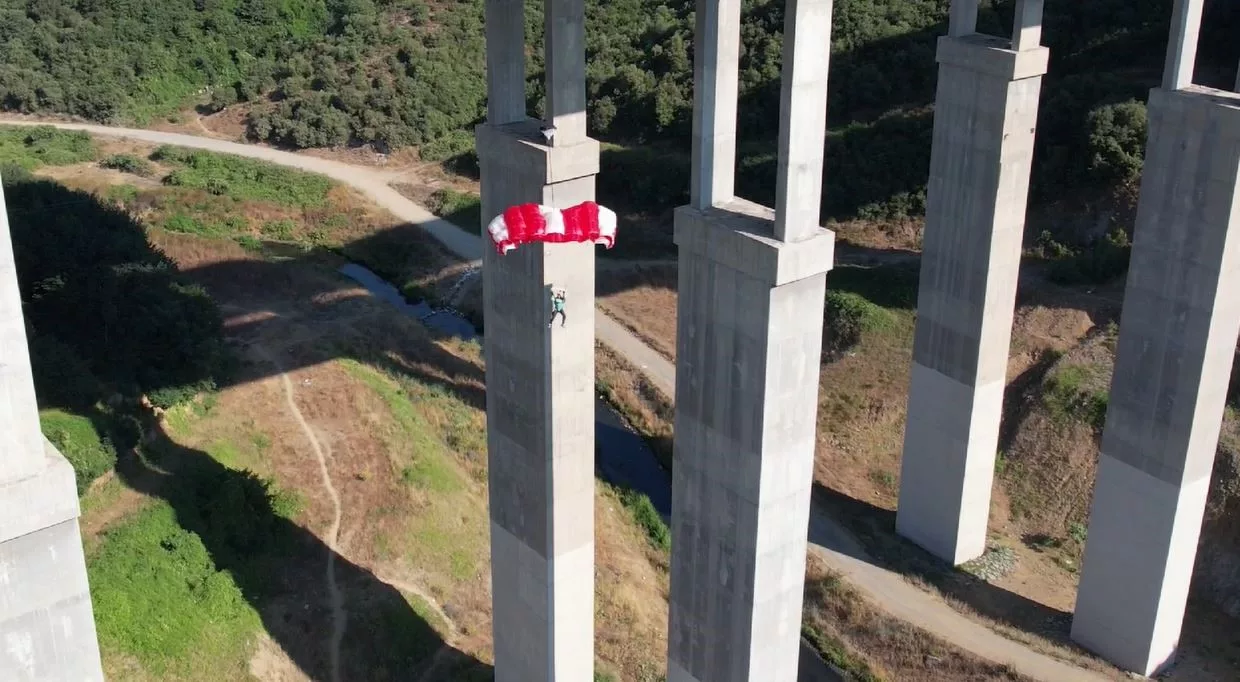 Extreme sports athletes Mert Güngörmüş, Samet Baydar, and Cengiz Koçak parachuted from an 86-meter-high viaduct in Istanbul’s Arnavutköy district. The daring jumps, performed early in the morning, were recorded by drones and helmet cameras.