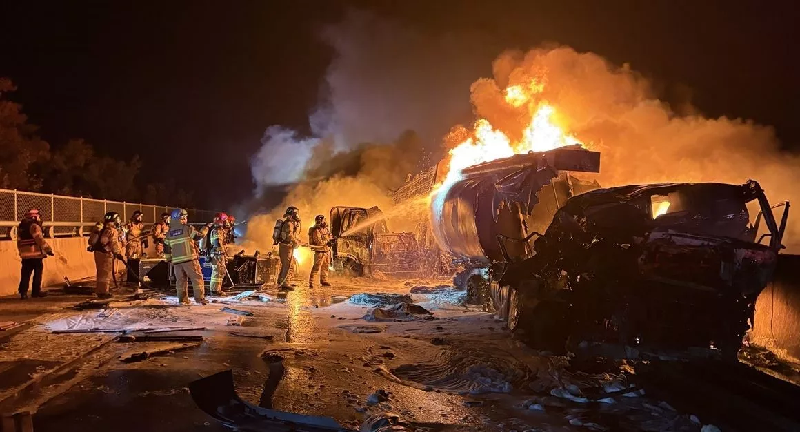 A 13-vehicle pileup on the Sangju–Yeongcheon highway in Yeongcheon killed two people and injured four. The crash occurred after a fuel tanker hit a cargo truck at 3:12 a.m. local time, triggering fires in three vehicles, including the tanker.