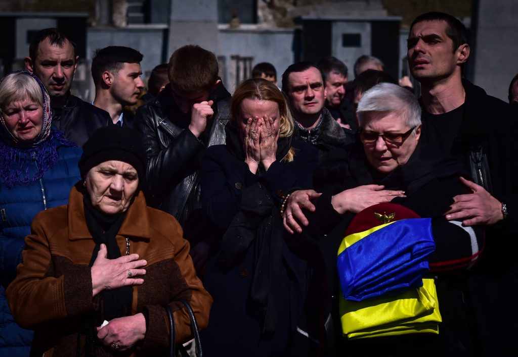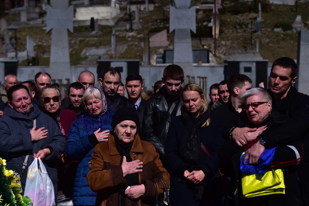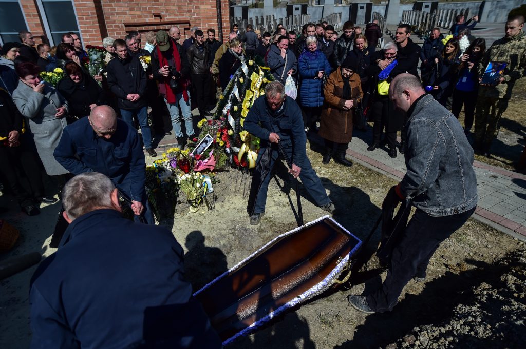 The body of 38-year-old Ukrainian soldier Igor Fedorchyk, who died in the conflict near the Ukrainian city of Nova Kahovka, was brought to Lviv and handed over to his family. The soldier’s family burst into tears at the funeral held at the Peter and Paul Church. Relatives of the soldier bid farewell to the soldier by kneeling down to show their respect while the coffin was being carried after the funeral. A ceremony was held at the cemetery for the deceased soldier.