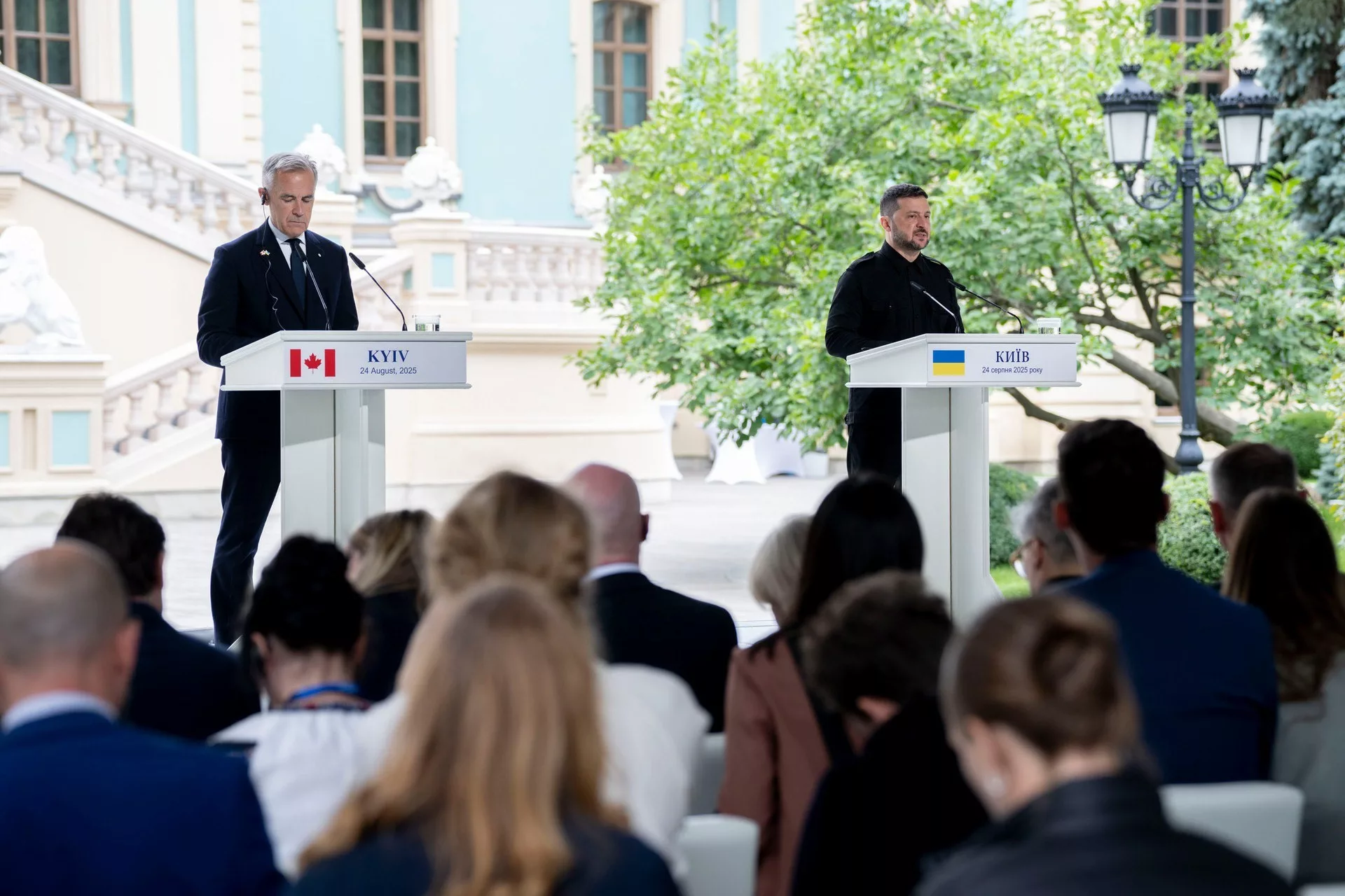 Ukrainian President Volodymyr Zelensky said future security guarantees must be “as close as possible to NATO’s Article 5,” ensuring Ukraine’s long-term safety after the war. He spoke in Kyiv alongside Canadian Prime Minister Mark Carney, who visited on Ukraine’s Independence Day.